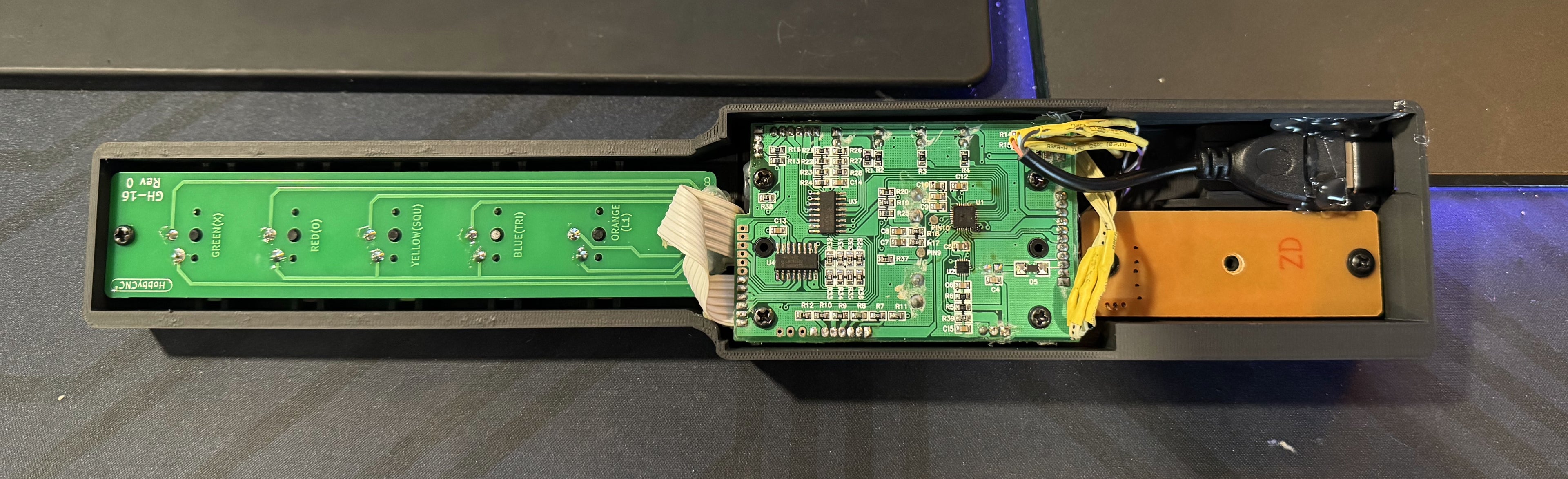 The first prototype controller I made was intended to be a one-off project. I had a BlockHead Grinder Wired guitar that absolutely sucked, and one day I decided to take it apart and see how it worked. Learning how simple the guitar controllers were inside, I realized that there were not many PCBs or parts needed to make a fully functional guitar. After two weeks or so of trial and error, I created this abomination by re-using all of the original BlockHead guitar parts in a custom fit case to make something travel sized.