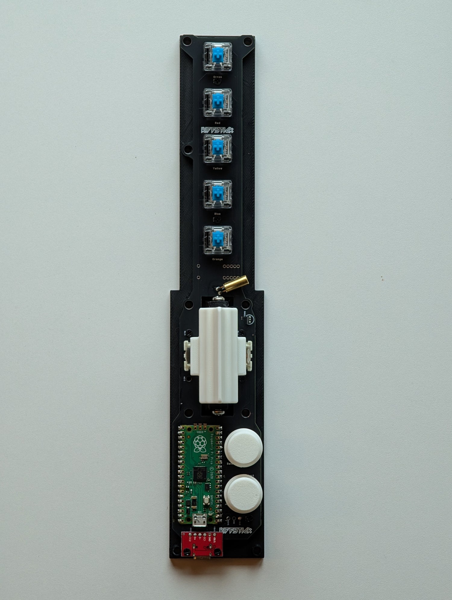 The RIFFSTICK PCB 1.1 fixed a few issues and features easier assembly for the USB C port, a hall sensor for magnetic whammy support, and breakouts to separate the fret section if desired to make a full-size controller. Minor design changes went into the printing of every element for the RIFFSTICK PCB 1.1 controller over the original RIFFSTICK PCB, however it likely is not noticeable besides the big Whammy bar in the side of the controller.