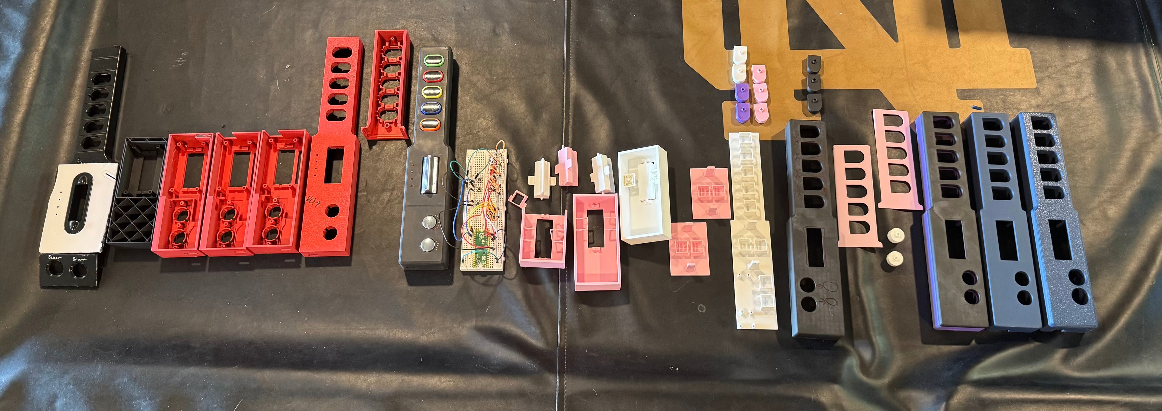 The original RIFFSTICK was 100% hand wired. Getting everything to fit and play "fine" took about a month and a half of daily work, leading to this controller I could assemble from nothing to finished in about 2 hours. It was slow and led to many mistakes and frustrations, but I was able to make about 12 of these hand-wired controllers before I decided it was time to look into custom PCBs to speed up the assembly process.